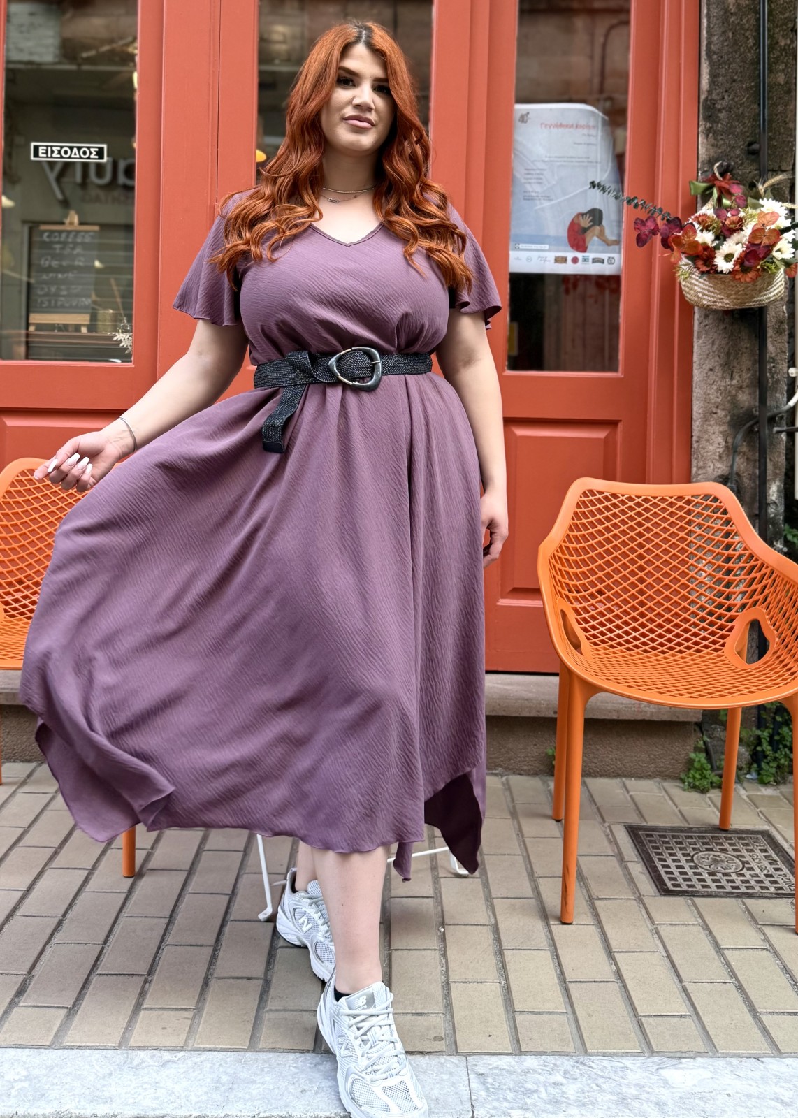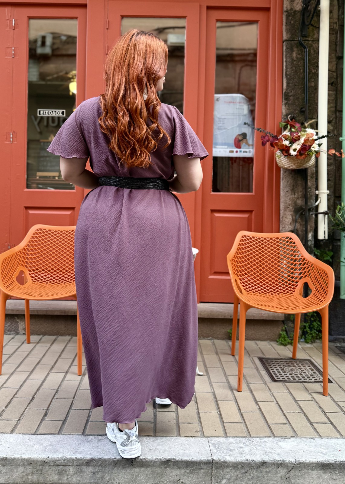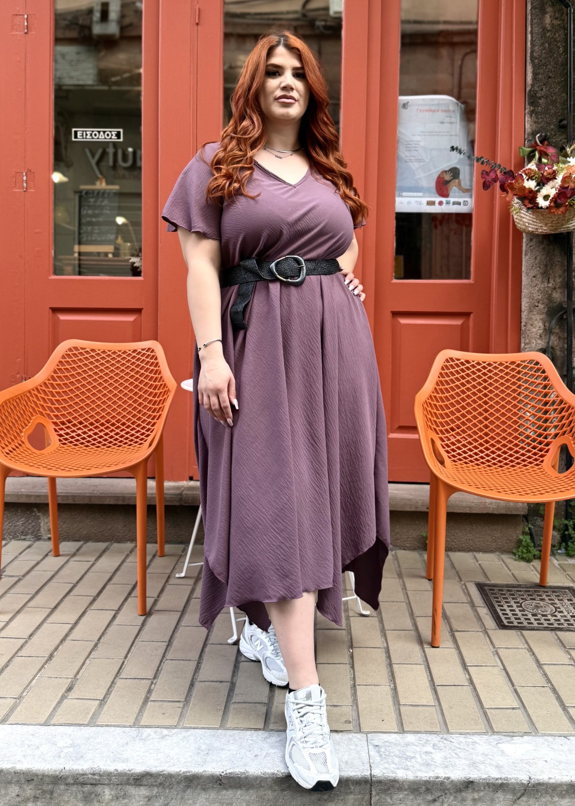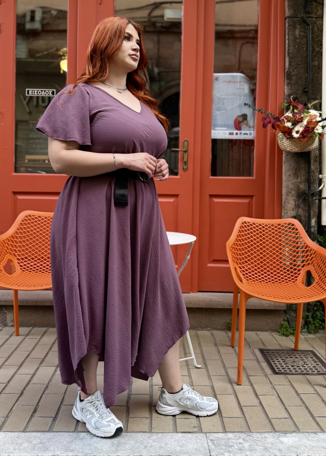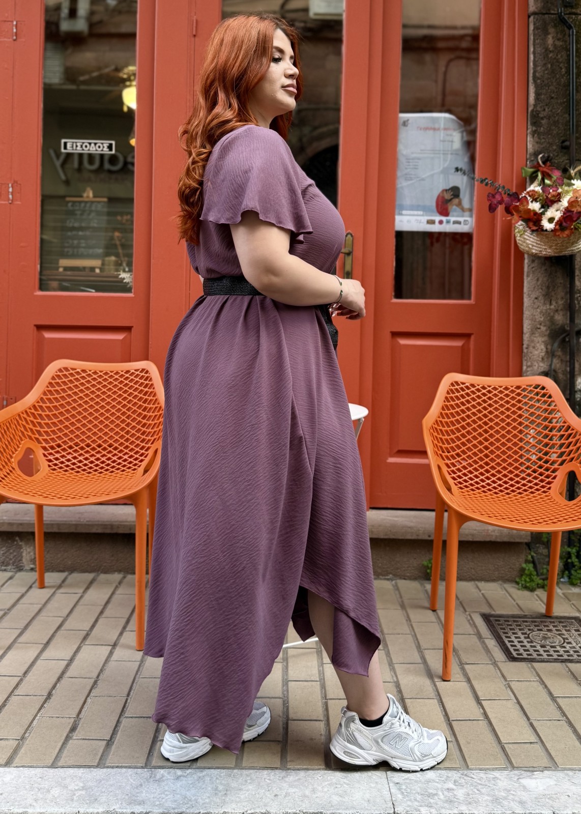 Εντυπωσιακό ασύμμετρο φόρεμα σε μωβ απόχρωση, ιδανικό για κάθε σωματότυπο. Διαθέτει ελαφρώς ντεκολτέ V, κοντό μανίκι τύπου νυχτερίδα και με μια ζώνη στη μέση μπορεις να τονίσεις τη σιλουέτα. Το ελαφρύ ύφασμα έχει ανάγλυφη υφή και προσφέρει άνεση και στυλ, χωρίς να κολλάει στο σώμα.